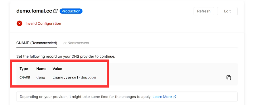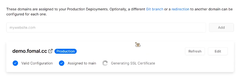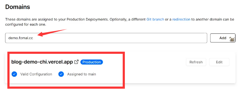 View Domains查看当前的域,我们可以看到仅有Vercel给你预分配的一个域名,此时我们输入刚刚购买的域名,我这里以二级域名demo.fomal.cc为例进行说明,添加后他会提示你添加一条DNS解析记录。