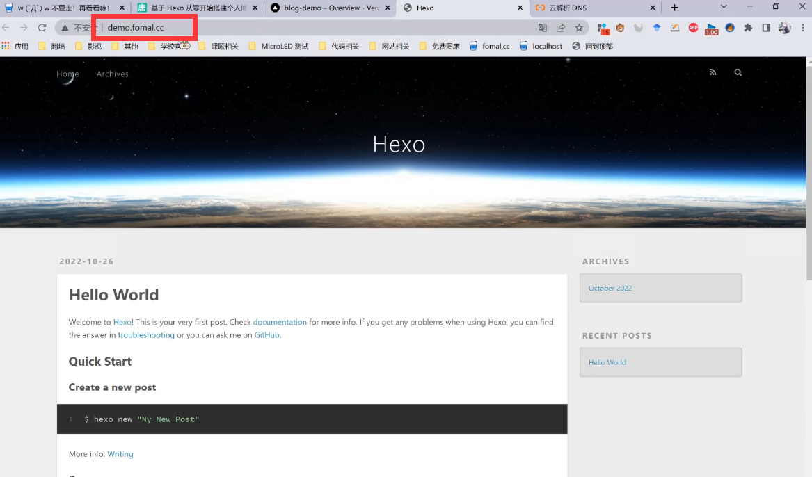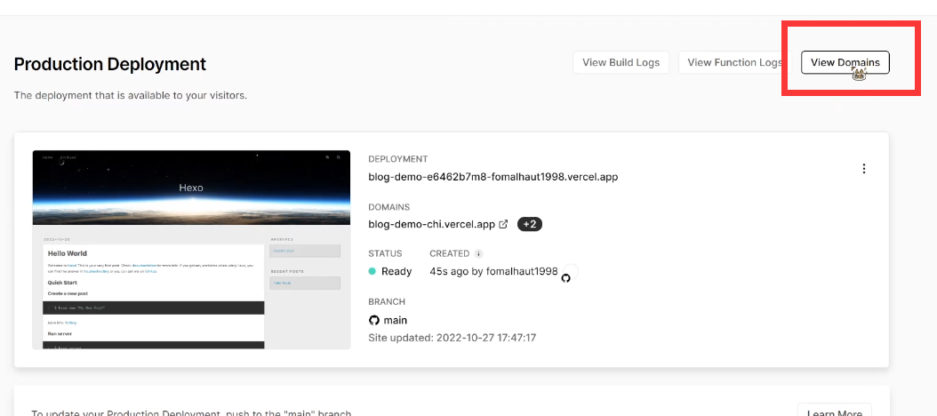 现在你的个人网站的地址是 username.github.io 以及在Vercel上有一个 blog-demo-chi.vercel.app。如果觉得不够定制化,可以购买一个专属域名。