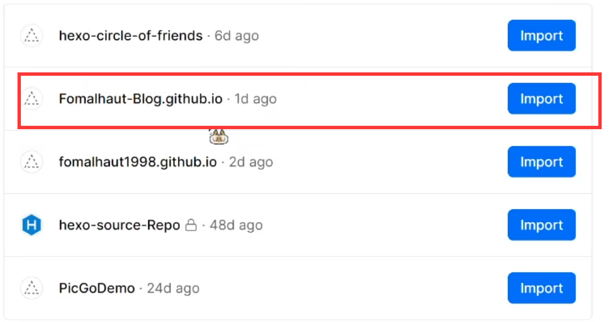 Add New Project创建新的项目,之后导入选项那里选择Continue with Github,这时候应该能看到你Github账号的仓库,选择你刚刚部署成功的存储静态博客的仓库<username>.github.io右边的Import选项,表示你要导入该仓库。 - 起一个只能有字母、数字或者或者连字符的项目名称,然后其他默认,点击