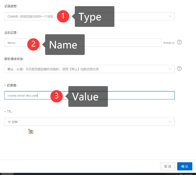 Type,主机记录对应Name,记录值对应Value,其他的设置默认即可。 - 回到Vercel刚刚查看域名的地方,如果操作没问题,应该会显示域名配置成功的提示,此时就可以通过自定义域名来访问我们搭建的网站了。